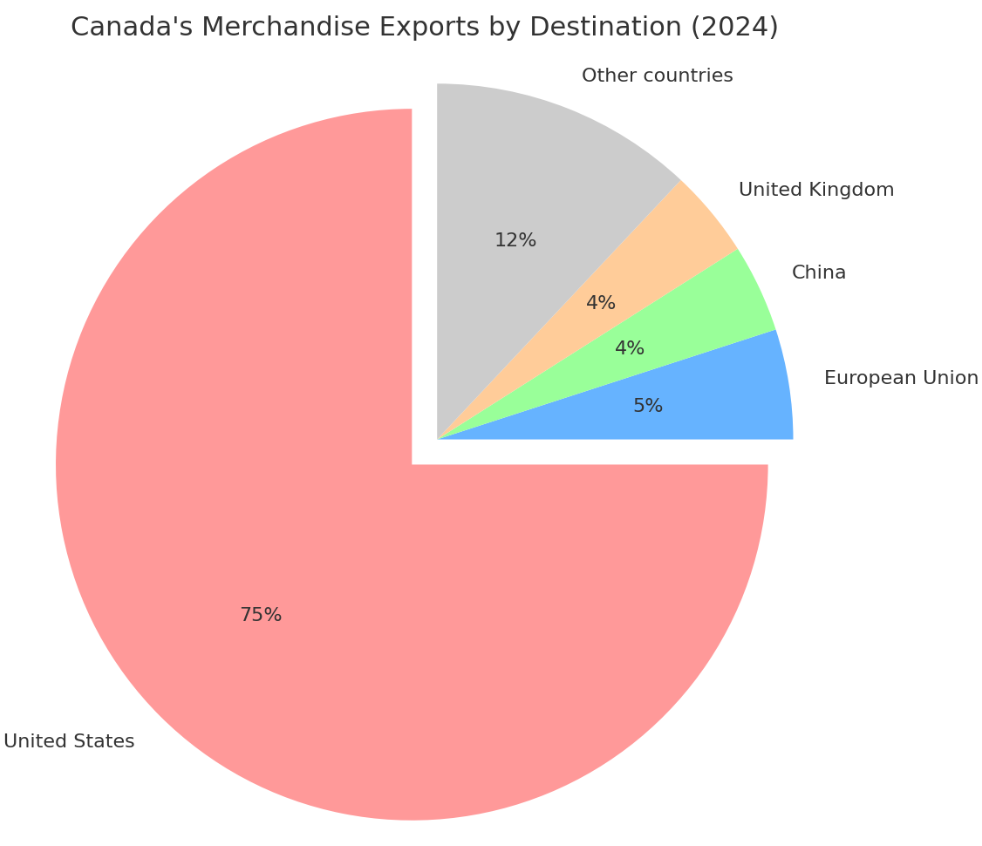 This is a concept borrowed from finance and ecology, basically, don’t put all your eggs in one basket. In economic terms, concentration risk means over-reliance on a single market, commodity, or sector, so that if that one thing has trouble, the whole economy feels the pain. Canada faces concentration risk in two big ways: sectoral and geographical. Sectoral, because a large chunk of our exports (and a good share of our economy) comes from a few natural resources, oil being a prime example. Geographical, because an overwhelming portion of our trade is with one partner: the United States. It’s like a farmer who only grows one crop, if that crop fails or prices crash, they’re in trouble. In Canada’s case, if the U.S. market sneezes (or raises tariffs), we catch a cold. How concentrated are we? As of recent data, about 75% of Canada’s merchandise exports go to the U.S. investorsfriend.com. That’s an enormous share, by contrast, no other single country accounts for more than 5% (the entire European Union is ~5%, and China and the U.K. about 4% each) investorsfriend.com. You can see this imbalance vividly in the chart below, where the big pink chunk is the U.S.: