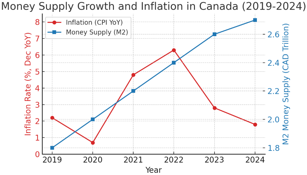 Friedman’s monetarist theory holds that if the money supply grows faster than the economy’s output, prices will inevitably rise. By that logic, the cure to inflation is tightening the money spigot (higher interest rates, less money printing). Canada followed this playbook in 2022 - 24: the Bank of Canada hiked rates sharply, money supply growth stalled, and inflation indeed came down. The red line in the chart below shows the inflation rollercoaster, and the blue line shows Canada’s money supply (M2) over recent years: